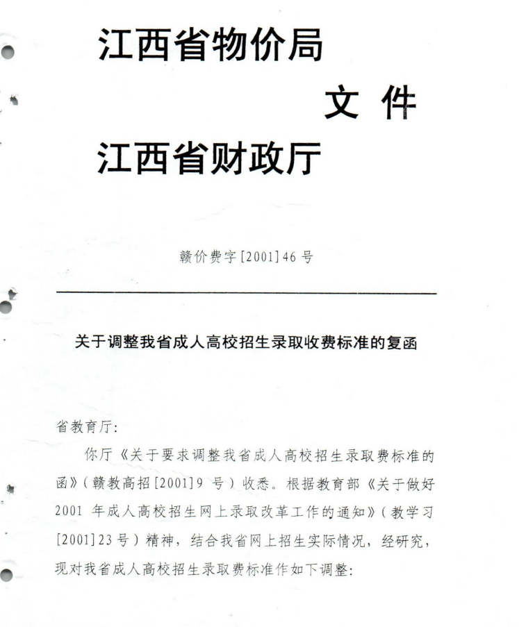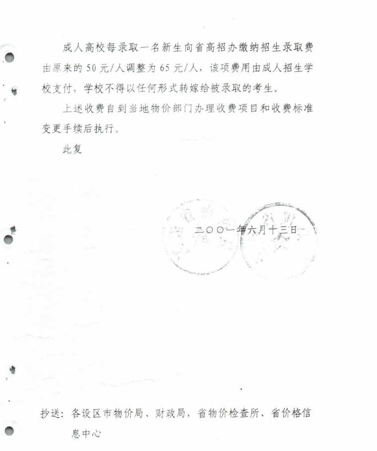 关于调整我省成人高校招生录取收费标准的复函