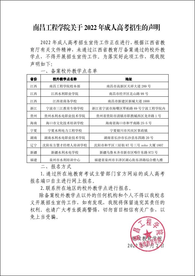 南昌工程公司关于2022年成人高考招生的声明